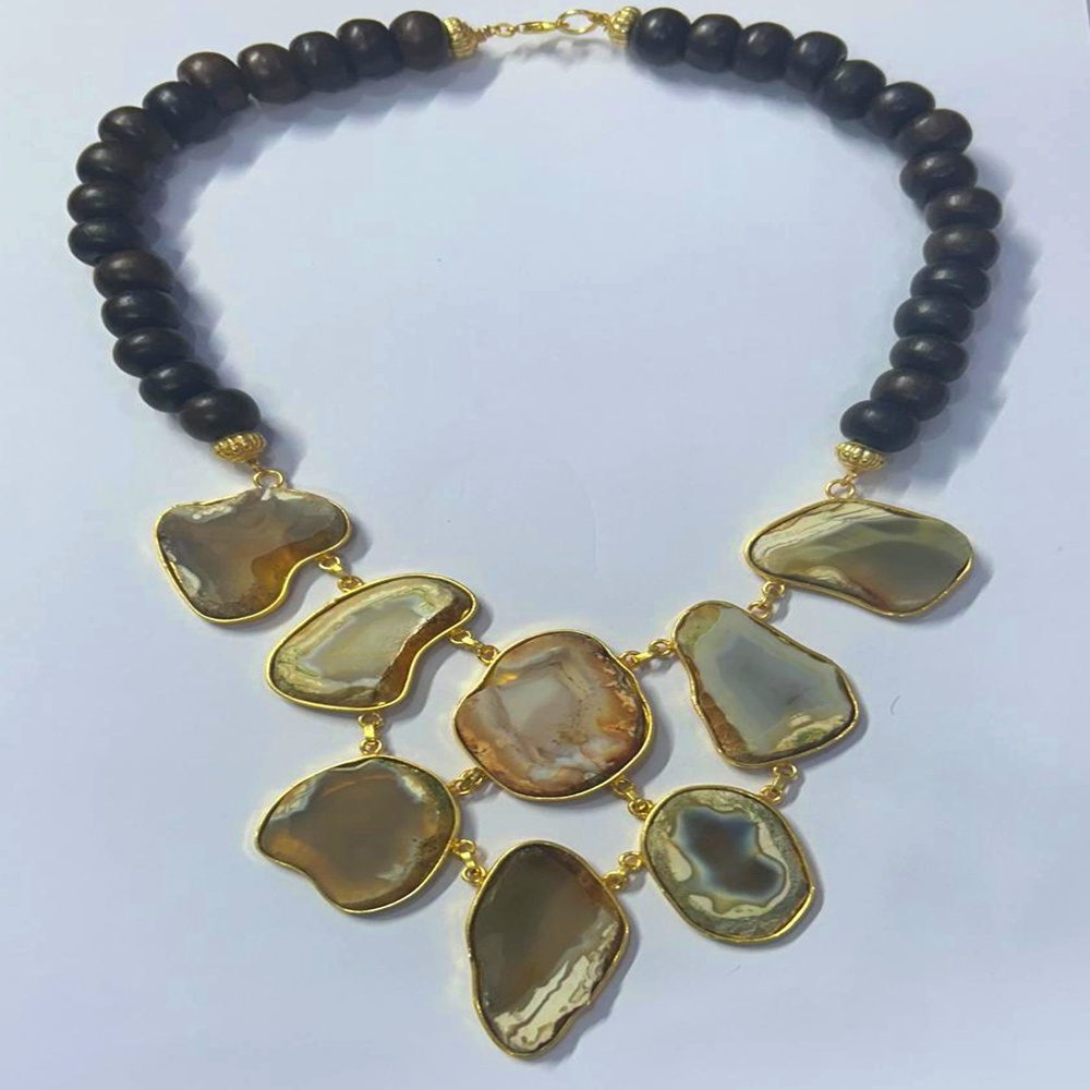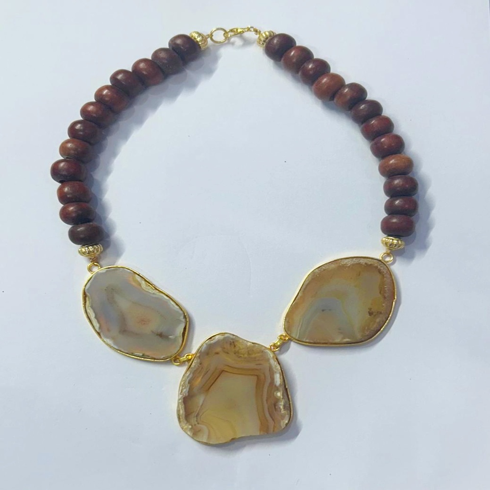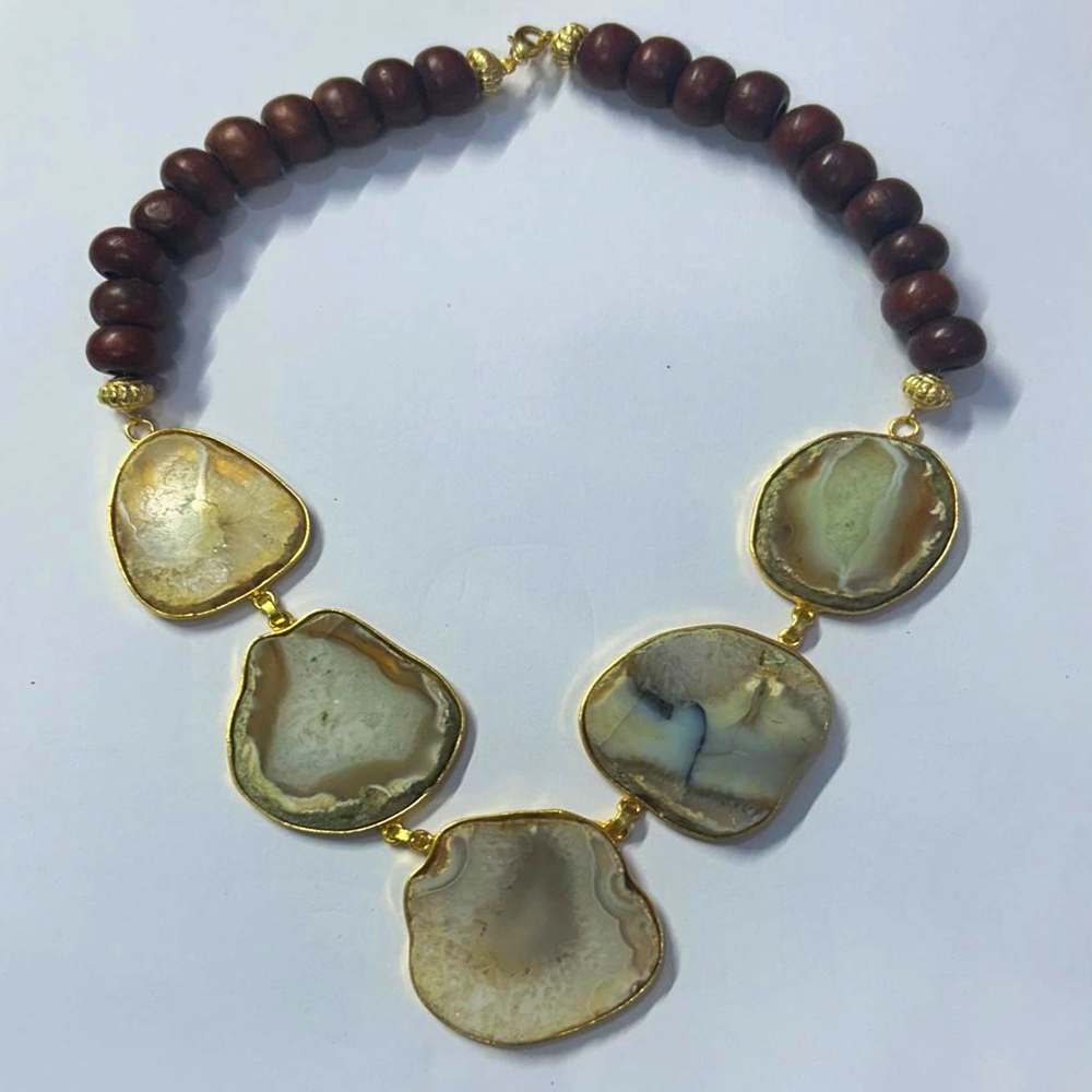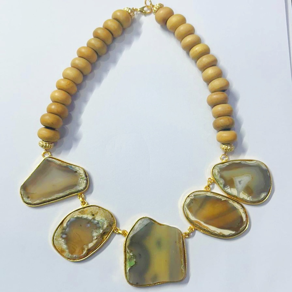 GOLD PLATED NATURAL AGATE SLICES DESIGNER NECKLACE WITH HAND CRAFTED WOODEN BEADS
