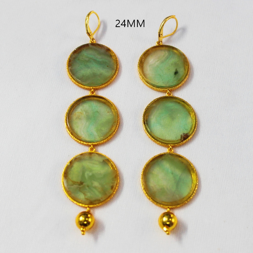 GOLD PLATED ROUND CERCLE 24 MM GREEN FLOURITE STONE SEATED DEIGNER EARRING