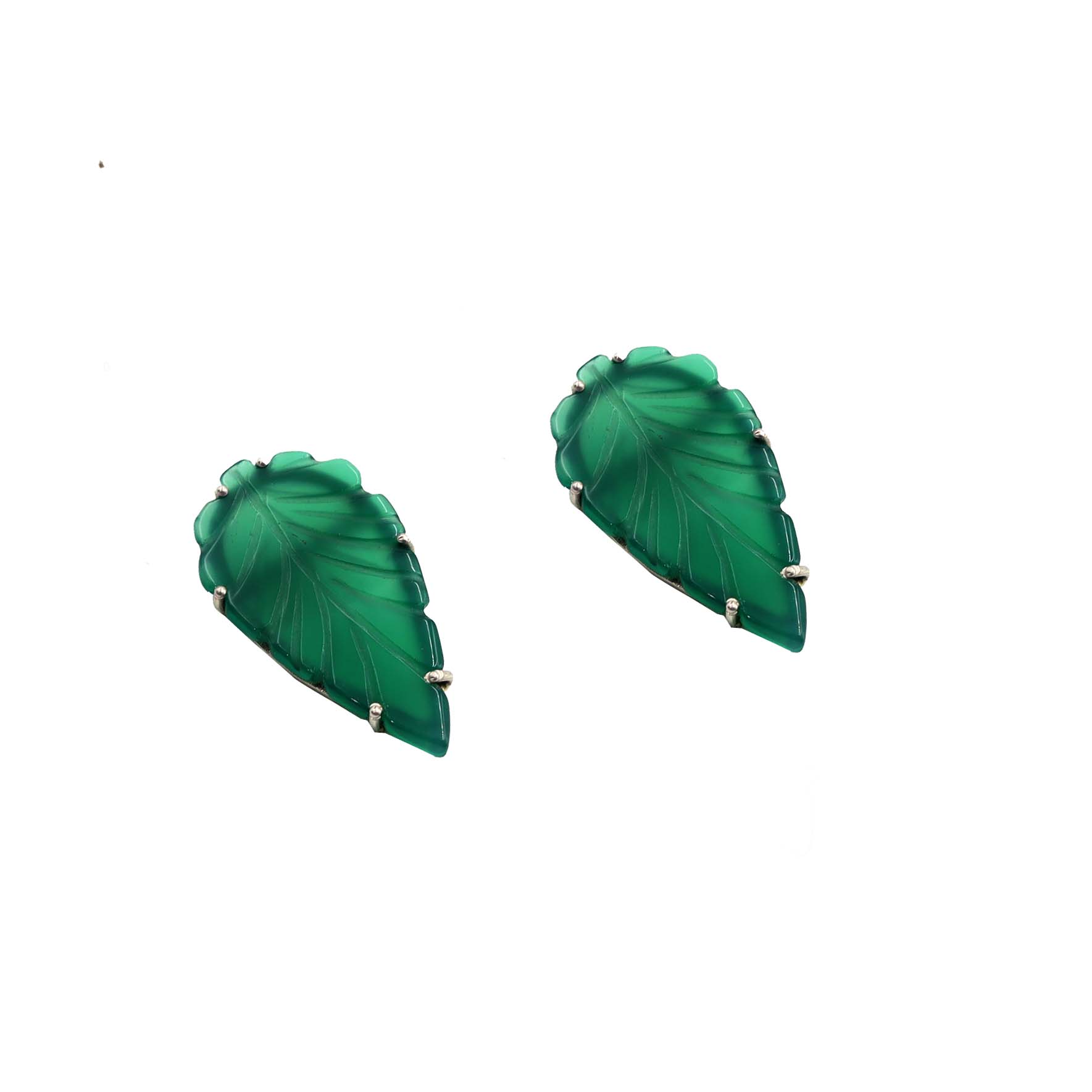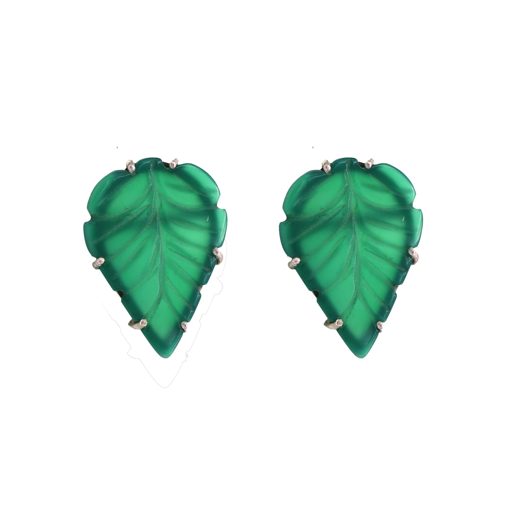 STERLING SILVER GREEN ONYX CARVING LEAF SEATED HAND MADE DESIGNER EARRING