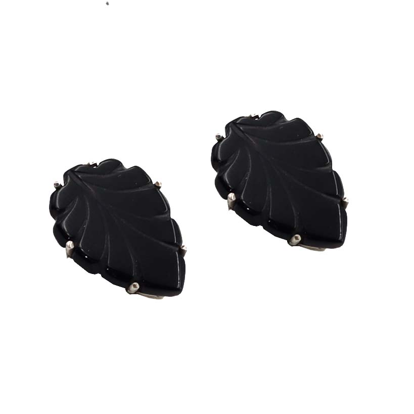 STERLING SILVER BLACK ONYX CARVING LEAF SEATED HAND MADE DESIGNER EARRING