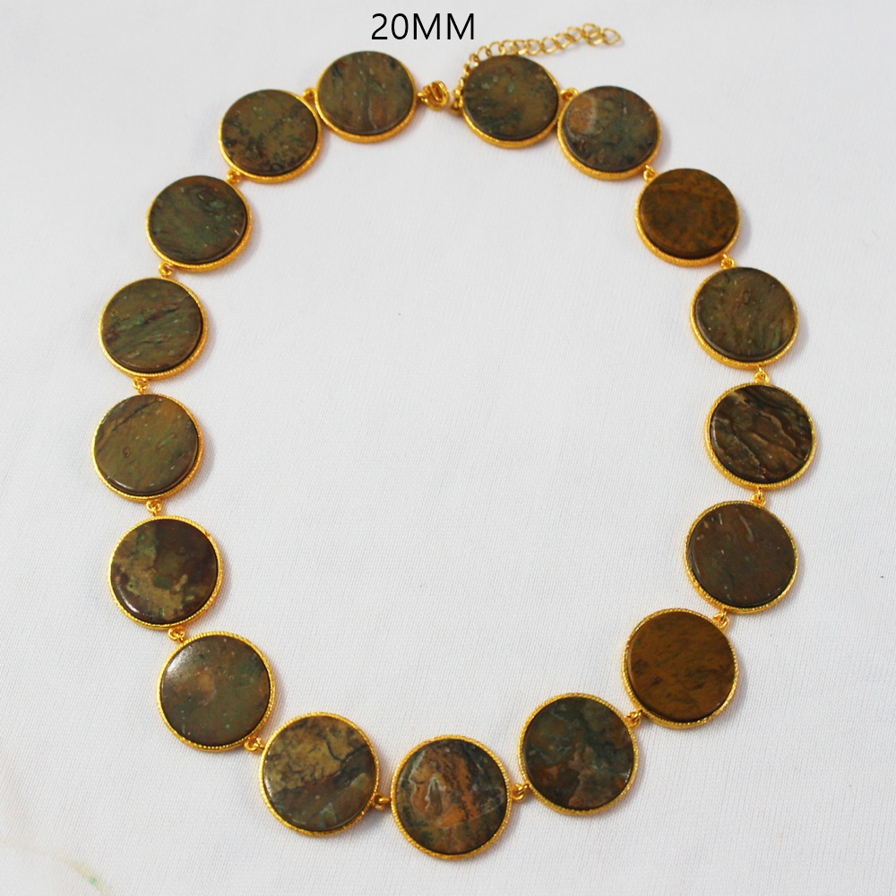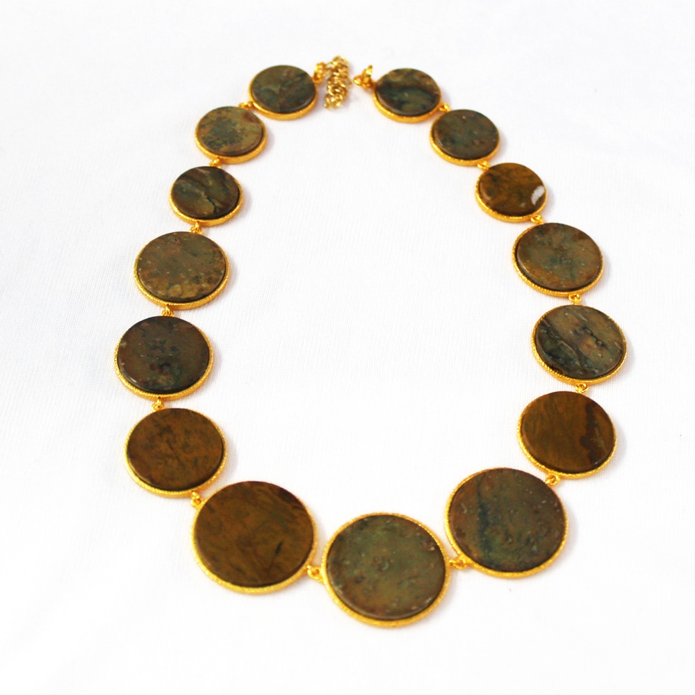 GOLD PLATED BRASS ROUND CERCLE MUTY SIZE HAND CUT POLISHED COCONUT JASPER STONE SEATED DESIGNER NECKLACE