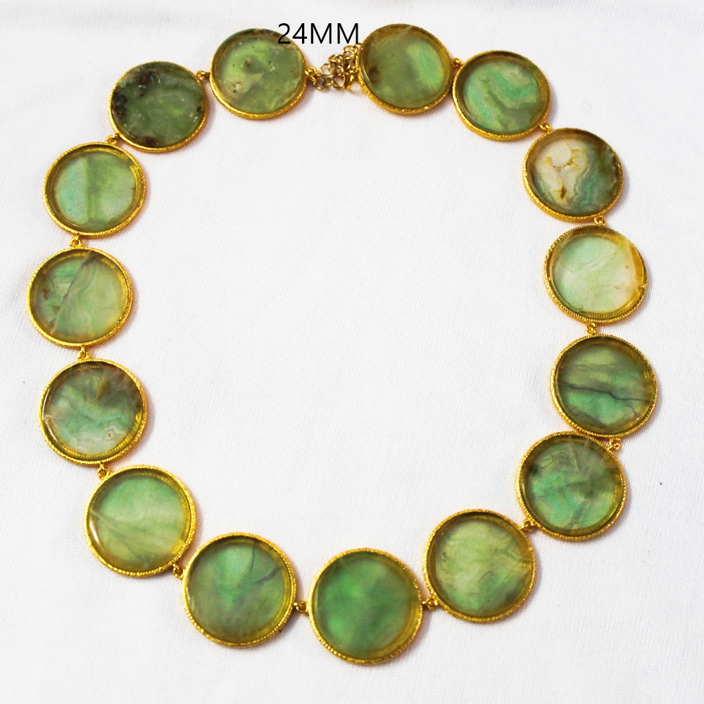 GOLD PLATED BRASS ROUND CERCLE MUTY SIZE HAND CUT POLISHED GREEN FLOURITE STONE SEATED DESIGNER NECKLACE