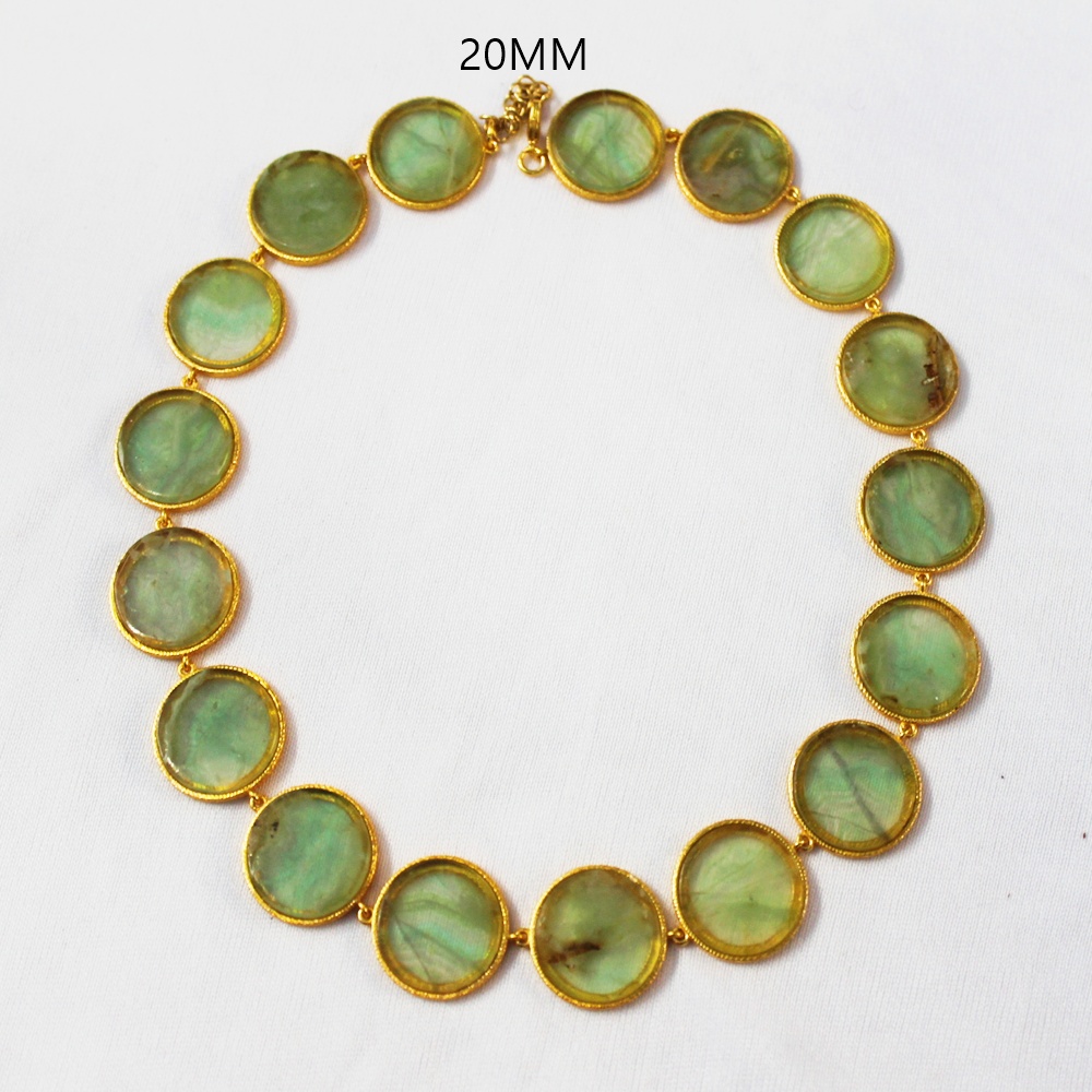 GOLD PLATED BRASS ROUND CERCLE 16 MM HAND CUT POLISHED GREEN FLOURITE STONE SEATED DESIGNER NECKLACE