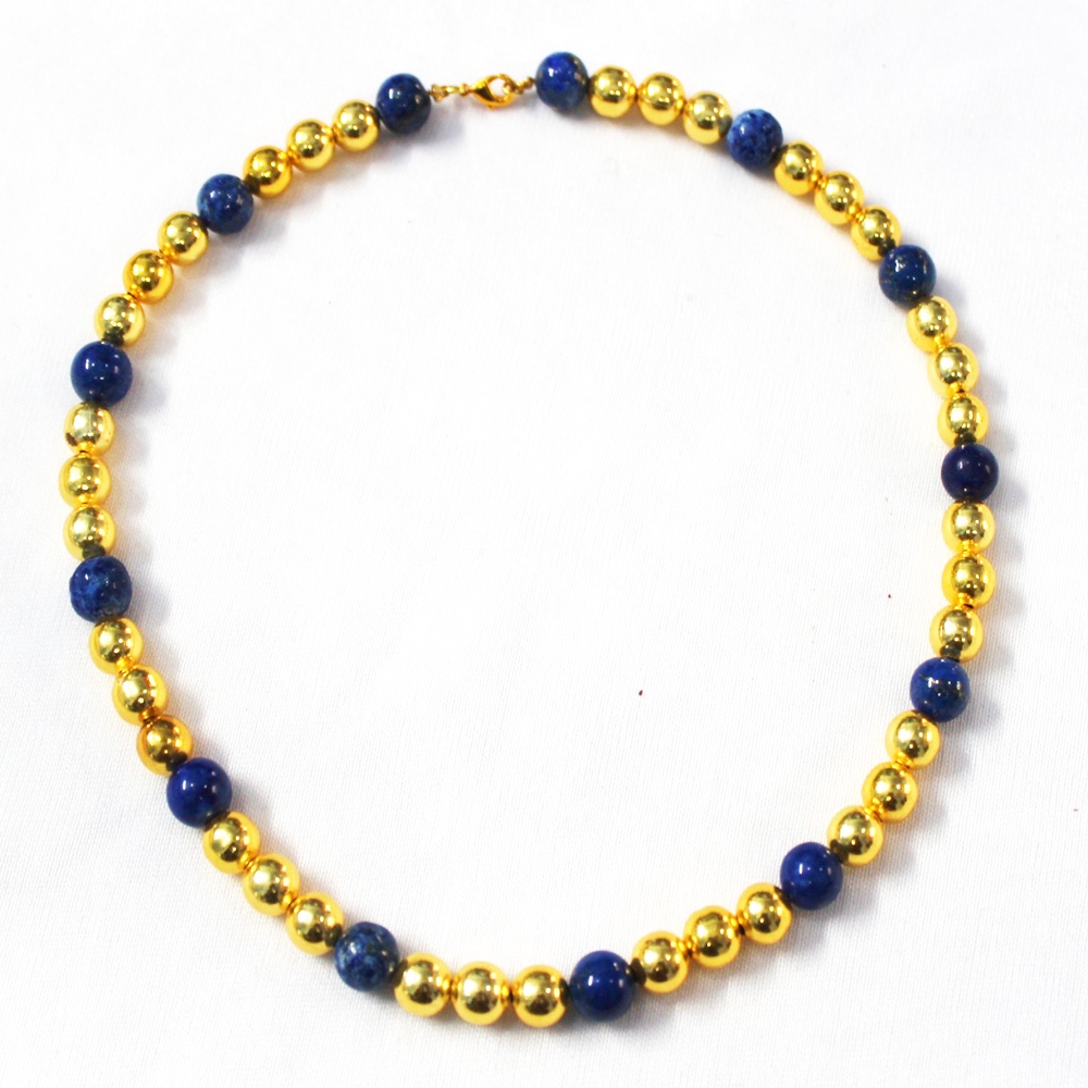 GOLD PLATED BALL AND LAPIS GEM STONE BEADS DESIGNER NECKLACE